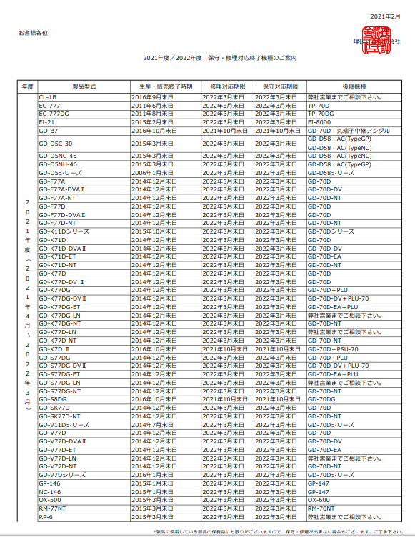2021年度/2022年度 維修?對(duì)應(yīng)終止機(jī)型的案內(nèi)【再通知】